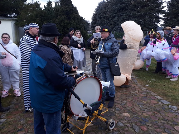 Zempern am 20.01.2018 Traditionell hat unser bunter Tross Geld, Eier, Speck und Spirituosen für unseren Schmausabend eingezempert. Nachdem wir uns um 9:45 Uhr auf dem Busplatz getroffen haben, ging es dann gegen 10 Uhr los in Richtung Vorstadt. Weiter dann in Richtung Gärtnerei, Winkel, Nehlsdorf und Dorfende. Wir wurden wieder freundlich von zahlreichen Dorfbewohnern mit kleinen Snacks oder wärmenden Getränken empfangen. Gegen 18.30 Uhr waren wir dann zurück am Busplatz. Den Ausklang fand unser Tag bei einem gemeinsamen Beisammensein im Freizeitzentrum. Wir danken hiermit nochmal all denen, die Geld und Naturalien für unseren Schmausabend gespendet haben. Wir hoffen dass nächste Woche viele den Weg in das Freizeitzentrum finden und wir eine schöne gemeinsame Feier haben werden! |
